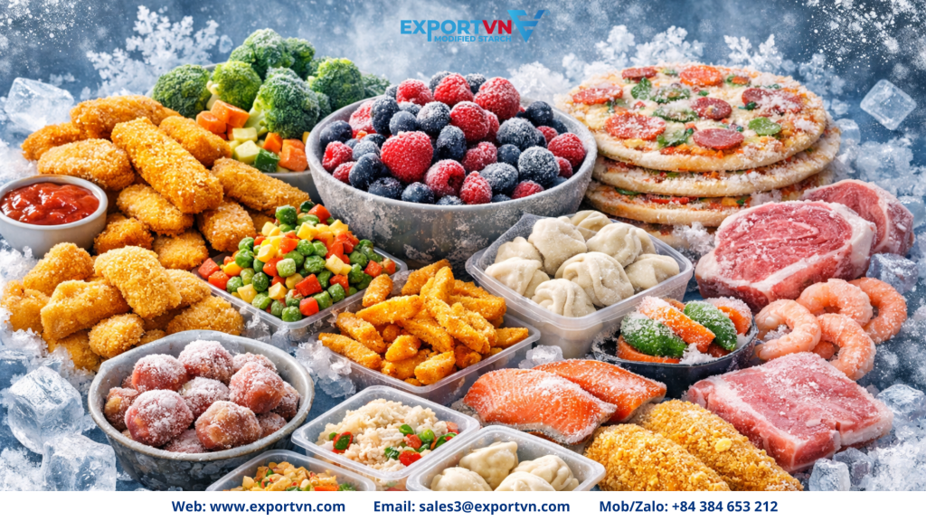 In this B2B technical guide, we will explore advanced cassava derivatives. Furthermore, we will see exactly how they stabilize your products during extreme temperature fluctuations. Specifically, we will analyze premium modified codes from EXPORTVN. These include E1414, E1450, E1442, and E1422. Accordingly, this guide provides the exact technical knowledge needed to optimize your global manufacturing. Mastering the application of Tapioca Starch in Frozen Foods benefits your automated factory immensely. For instance, the material will effortlessly reduce product waste and improve visual appeal. Additionally, the solution significantly extends commercial shelf life across multiple categories.